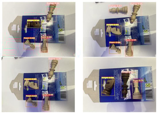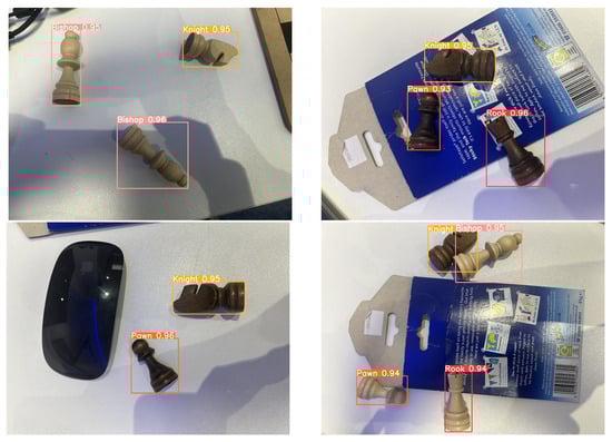 Figure 16 and Figure 23 show the test results of the object recognition model trained using purely synthetic data on real images. It can be seen from the figures that the model successfully identifies and classifies multiple chess pieces (bishop, rook, pawn, knight), with generally high detection confidence. Most of the target objects have a detection confidence above 0.90, indicating that the model has high accuracy in practical applications. Moreover, even in complex backgrounds or when objects overlap with each other the model is able to simultaneously detect and classify multiple target objects. For example, in several images, the rook, pawn, and knight are detected simultaneously, and all classifications are correct. However, there are also instances where lower detection confidence can be observed. For example, in Figure 16 the model identifies the “rook” with a confidence of 0.78. This may be related to the limitations of the synthetic dataset. Although the synthetic dataset provides diverse scenes and lighting conditions during model training, it may still fall short of covering all the complex scenarios encountered in real-world applications. For instance, background text and patterns might not have been adequately represented in the training data, which could affect the model’s ability to accurately delineate object boundaries.