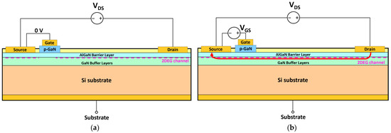 Figure 1. Basic structure of an e-GaN HEMT: (a) OFF-state biased (VGS = 0 V); (b) ON-state (VGS ≥ VGS(th)) forward conduction. From [14].