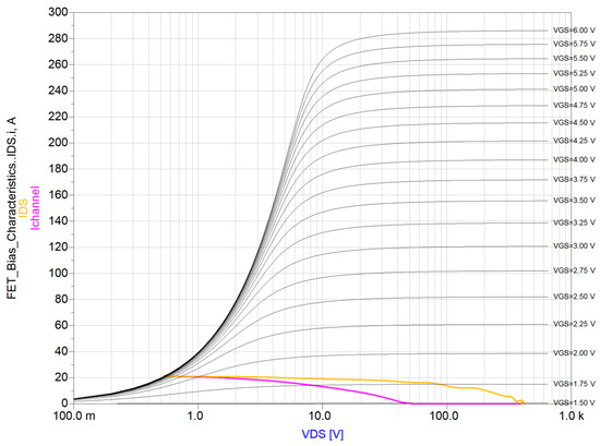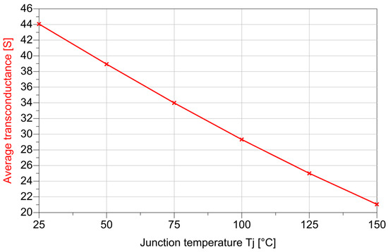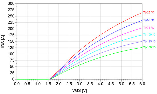 The Pspice non-linear dynamic model was provided by the manufacturer and imported into ADS to be used for our detailed study of commutation behavior. Several simulations were performed to assess the capability of the model to properly reproduce the measured static and dynamic electrical quantities reported in the device datasheet. The adopted device model is also a fully electrothermal model that internally computes dissipated power and calculates the channel temperature exploiting the thermal impedance of the device and the ambient temperature [13,15,16]. Moreover, the model’s characteristics (e.g., RDS,on and VGS(th)) are temperature-dependent, and their values are continuously updated during the time domain simulation, exploiting the information of the computed channel temperature. Thus, self-heating simulations can be performed by simply fixing the ambient temperature as an input.