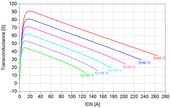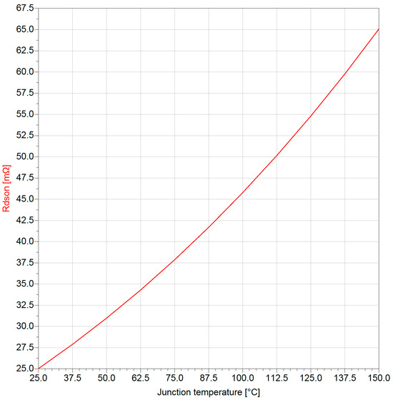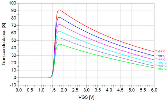 GaN devices exhibit a stable gate-source threshold voltage VGS(th) over temperature and a negative temperature coefficient of the transconductance (Figure 2, Figure 3, Figure 4, Figure 5 and Figure 6), in addition to a positive temperature coefficient of the RDS,on (as depicted in the simulation result shown in Figure 7). This implies easier thermal balance and superior paralleling capability compared to SiC and Si devices [17], making GaN particularly suitable in applications where multiple devices in parallel are required, e.g., high-frequency and high-current multilevel topologies [7,18,19], in which GaN is used to overcome the reduced blocking voltage (up to 650 V for commercial devices) compared to SiC and Si. At the same time, GaN can benefit from its excellent transconductance, ensuring low rise/fall times during switching transitions and enabling exceptional dynamic performances due to the combination of reduced parasitics and a high switching frequency regime.