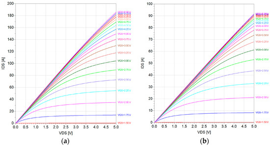 Figure 30. Post-layout simulation results: (a) VGS and VDS of Q5–Q6; (b) VGS and VDS of Q7–Q8.