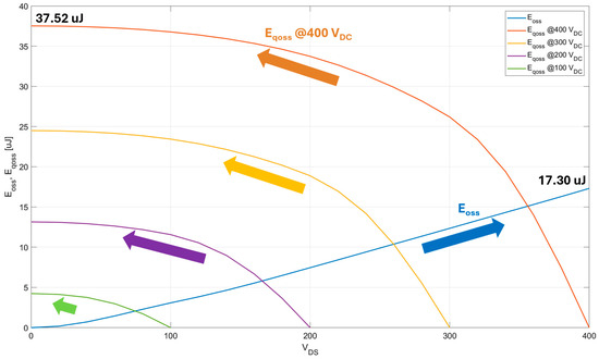 Typically Eqoss is not listed in the datasheet; instead, it is part of Eon_external. Eqoss and Eoss of the GS-065-060-5-T-A GaN HEMT device were calculated from (1) and (2) through a MATLAB script by making use of the Coss(VDS) curve in the datasheet. As observed in [20], this information can be conveniently displayed in a plot of Eqoss/Eoss energies vs. the actual VDS swing across the device. Figure 8 reports this plot for the GS-065-060-5-T-A GaN HEMT. For Eqoss, each value of the rail voltage VDC identifies a different curve. The following results are obtained from the plot for the case VDC = 400 V: