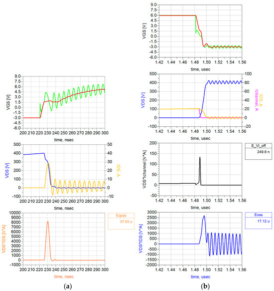 Figure 9. DPT of GS-065-060-5-T-A: (a) At turn-on of the first pulse: extrinsic VGS (in green) and intrinsic VGS (in red), VDS and IDS, the product of VDS and IDS (the instantaneous dissipated power) and the corresponding calculated Eqoss; (b) At first turn-off: extrinsic VGS (in green) and intrinsic VGS (in red), VDS, IDS and Ichannel, the instantaneous dissipated power through the channel and the corresponding calculated EVI_off, the instantaneous dissipated power and the corresponding calculated Eoss.