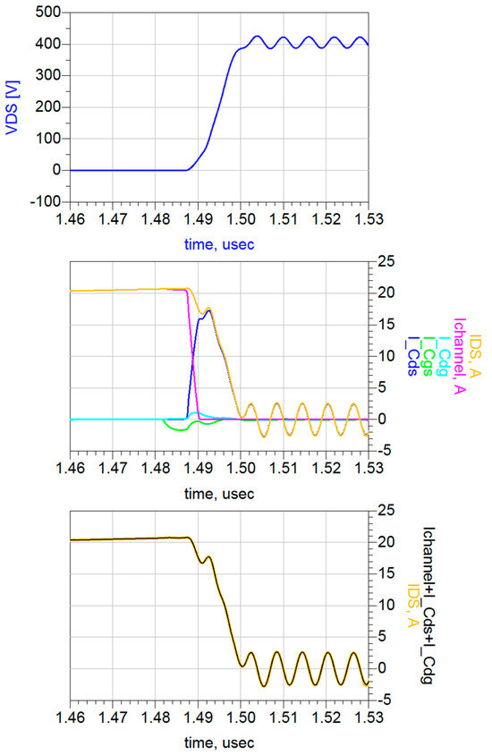 Figure 10. DPT of GS-065-060-5-T-A at first turn-off: contributions of the IDS current at the drain node. In the third plot, the IDS waveform (in orange) has twice the thickness of the sum of its contributions (in black).
