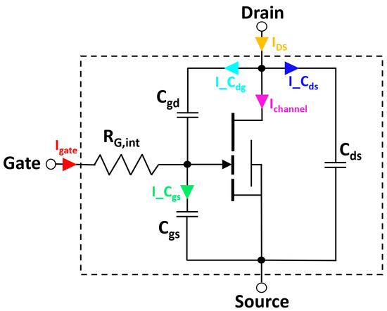 Figure 11 displays the equivalent circuit of an e-GaN HEMT, highlighting the channel current and the currents of parasitic capacitances.