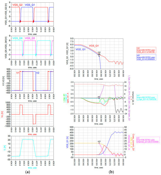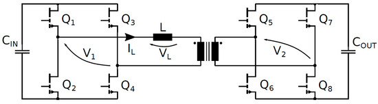 DAB waveforms (400 V/400 V, 6.6 kW, 300 kHz, 25 °C, VGS = 6/−3 V, and RG = 10/2 Ω) simulated through ADS are displayed in Figure 13. The Allegro driver AHV85110 rise/fall times (0–100%) are quantified in 30 ns. Dead time is equal to 100 ns. The names of the electrical quantities in the waveforms of Figure 13 correspond to the labels in Figure 12. In the SPS modulation, the switches on the same diagonal (Q1–Q4, Q2–Q3, Q5–Q8 and Q6–Q7 in Figure 12) are ON/OFF for half a period and share the same gate signal. Figure 13 shows that when the pair Q2–Q3 is turned off, the negative inductive current IL charges the Coss of Q2–Q3 to 400 V + Vf and discharges the Coss of Q1–Q4 to −Vf, where Vf = VGS(th) + |VGS,off| and is the diode-equivalent forward voltage of GaN in reverse conduction [14]. In our case, −Vf ≈ −4.6 V. Then, V1 commutes to 400 V + 2Vf and VL to 800 V + 2Vf, and the series inductor is charged. Similarly, when Q6–Q7 pair is turned off, V2 commutes to 400 V + 2Vf and VL to −2Vf (since, in the meantime, Q1–Q4 pair has stopped reverse conduction), and the series inductor is slowly discharged. In the second half of the period, Q1–Q4 pair is turned off (V1 toggles to −400 V −2Vf and VL to −800 V −2Vf), followed by Q5–Q8 (V2 toggles to −400 V −2Vf and VL to +2Vf).