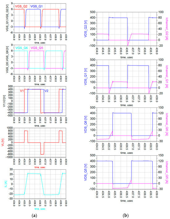 Figure 13. DAB waveforms: (a) VGS of Q1 and Q2, VGS of Q5 and Q6, primary (V1) and secondary (V2) voltages, series inductor voltage VL and series inductor current IL; (b) VDS and Ichannel of Q2, VDS and Ichannel of Q1, VDS and Ichannel of Q6 and VDS and Ichannel of Q5.