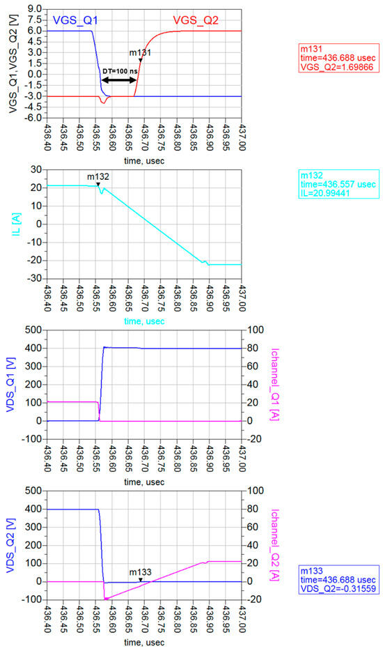 Let us now look in detail at the DAB ZVS turn-on, for instance for the pair Q2–Q3. ZVS boundaries depend on the total energy stored in the series inductor and can be calculated as reported in [27,29,30,31]. At nominal full power, as in our case, the ZVS condition is assured by design (the selection of a suitable series inductance with respect to VDC voltage, device Coss, switching frequency and dead time). Figure 14 shows that when Q1–Q4 pair is switched off, during dead time, the positive inductive current IL charges the Coss of Q1–Q4 to 400V + Vf and discharges the Coss of Q2–Q3 to −Vf. Hence, Q2–Q3 pair is in reverse conduction in the third quadrant, acting as equivalent free-wheeling diodes (the gate is OFF). Then, when the gate-source voltage of Q2–Q3 goes above the threshold (which is equal to 1.6 V in the Pspice model), they are forward-biased with an almost null drain-source voltage, which further decreases in absolute terms from −Vf to −VDS,ON. The negative sign of VDS is due to the fact that Q2–Q3 pair has opposite polarity when IL is positive (see Figure 12). As is clear from Figure 14, the switching transient of the drain-source voltage (400 V swing) exhibits a very short time duration (17 ns): the high commutation speed of GaN devices enables the implementation of a very short dead time (typically between 50 and 100 ns), minimizing the third-quadrant losses.