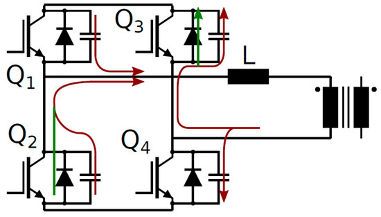 Figure 15. DAB schematic view of Q2–Q3 ZVS turn-on mechanism. Brown arrows indicate capacitive displacement currents, and green arrows indicate reverse conductive currents in third-quadrant operation.