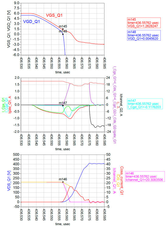 The Cgd deep discharge begins at VGS = 1.26 V, causing device voltage/current transitions, meaning that a strong driver and low values of Cgd can pull the Miller voltage below the threshold [33]. In fact, this latter is equal to 1.6 V. This denotes that the voltage transient is not controlled by the gate driver but rather by the Coss and the load current [23,34]. The 2DEG channel is pinched off during voltage commutation [33], which starts when VGD = 0 V.