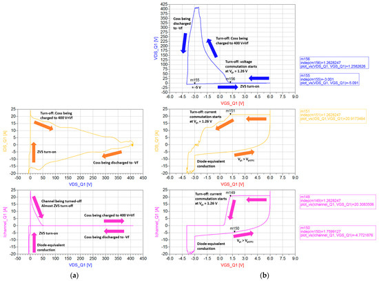 For a full and intuitive picture of the device commutation behavior within an entire switching period, it is useful to plot IDS and Ichannel currents versus VDS and VGS voltages. Figure 17 reports these waveforms for Q1. Also, VDS versus VGS is displayed. Plots in Figure 17a are clockwise, while plots in Figure 17b are counter-clockwise. The ZVS turn-on and almost ZVS turn-off are highlighted. Also, the beginning of voltage and current transitions in correspondence with VGS = 1.26 V < VGS(th) = 1.6 V at turn-off is clearly shown. VDS overvoltage and VGS dip at commutations are visible. Moreover, the full voltage across the device in the third-quadrant operation (−VGS(th) − |VGS,off| − Rds,rev · ISD ≈ −5 V) [14] is marked in the first plot of Figure 17b.