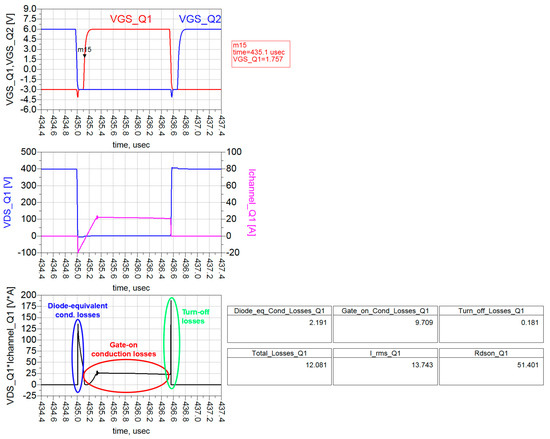 A deep insight into the strong (VGS,off = −3 V, RG,off = 2 Ω) and very low-loss turn-off of a GaN HEMT is provided hereafter. In particular, Q1 of the DAB converter is under exam, but similar conclusions can be reached through a DPT simulation as well. Looking at Figure 16, the first part of a turn-off is characterized by a Cgs discharge (the Cgs current is the green line in the second plot), with VGS of Q1 decreasing from 6 V to 1.26 V. At this point, Cgd (in cyan color) also starts to be deeply discharged, and voltage/current commutations begin. Hence, the strong driver has enough current to discharge Cgd and Cgs at the same time during this second phase. This also implies the absence of a Miller plateau at the turn-off for GaN HEMTs [32]. Channel current (in magenta in the third plot) rapidly goes to 0 A (in 5 ns), while VDS is at the beginning of its transition, reaching only 50 V on a total 400 V swing. Therefore, an almost ZVS turn-off is achieved, and power dissipation through the channel can almost be neglected.