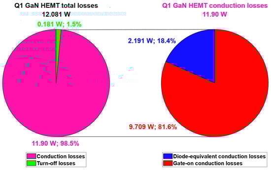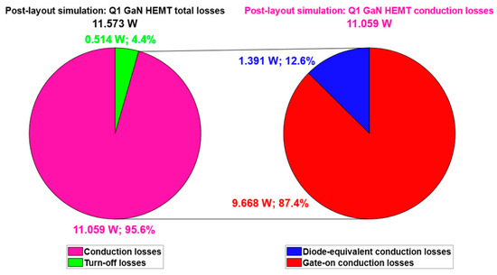 The overall losses of Q1 GaN HEMT are reduced by about 0.51 W with respect to the electrical simulation reported in Section 3 (Figure 19 and Figure 20), which exploits Vgs,off = −3 V. The pie chart in Figure 33 displays the weights of the different contributions to Q1 losses.