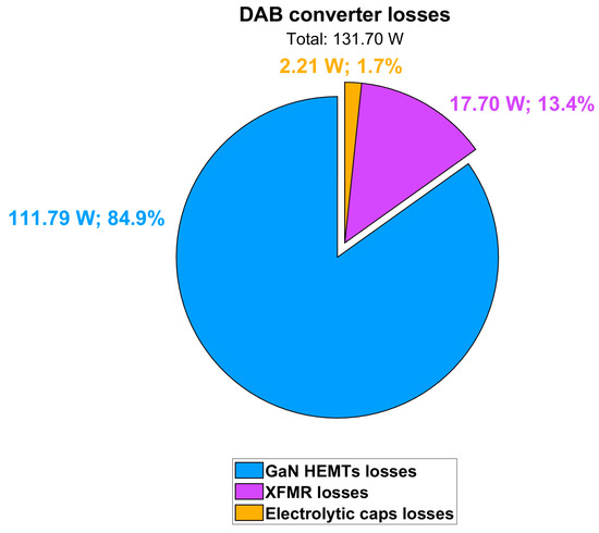 Taking all these loss contributions into account, total dissipated power is quantified as 131.70 W, and the DAB efficiency turns out to be 98.04%. A pie chart of the DAB converter losses is shown in Figure 21.