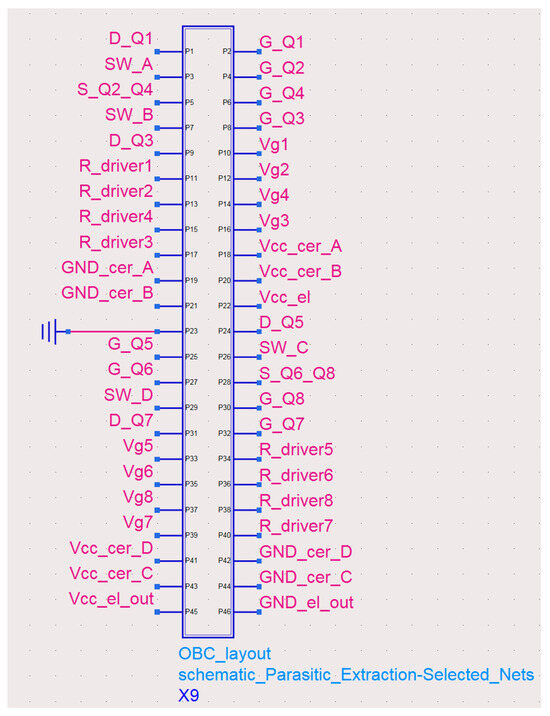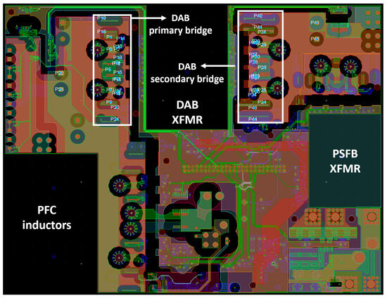 Figure 24 shows the on-board charger PCB layout with the DAB bridges and magnetic positioning highlighted, while Figure 25 displays the ports that have been placed for gate-source and drain-source PCB loops in order to execute the EM simulation, in particular with reference to the primary GaN bridge. Top-side cooled GaN HEMTs are placed on the bottom layer of the board, while drivers and capacitors are placed on the top layer. The layout was designed to exploit the flux cancellation technique to minimize parasitic inductance. The board of the OBC prototype is illustrated in Figure 26.
