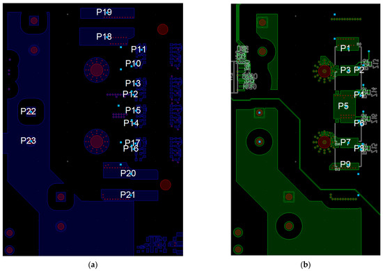 Figure 25. Port placement (PXX) in the primary GaN bridge: (a) for drivers, ceramic and electrolytic capacitors on top layer; (b) for GaN HEMTs on bottom layer.