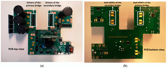Figure 26. OBC prototype: (a) top view; (b) bottom view. EMI filter card and magnetics are not shown.