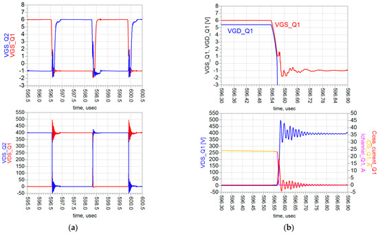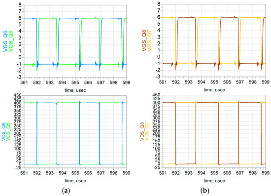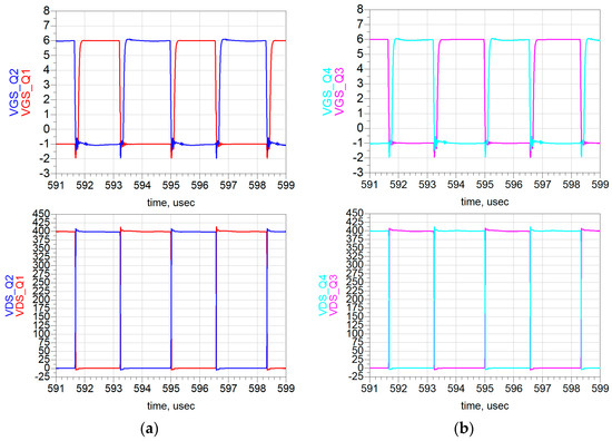 Figure 29. Post-layout simulation results: (a) VGS and VDS of Q1–Q2; (b) VGS and VDS of Q3–Q4.