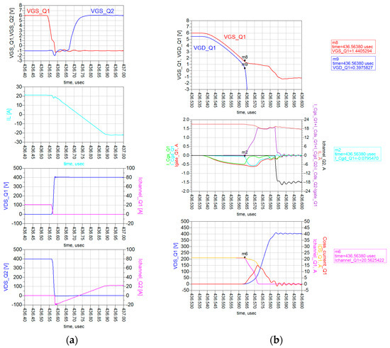 Figure 35. Worse design simulation results: (a) VGS of Q1 and Q2 and VDS of Q1 and Q2; (b) Q1 almost ZVS turn-off.