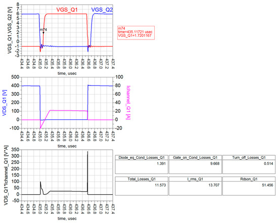 Figure 29, Figure 30, Figure 31 and Figure 32 display the results of the post-layout simulation of the DAB converter. The following operating conditions are assumed: Vin = 400 V, Vout = 400 V, Pout = 6.6 kW, fsw = 300 kHz, VGS = 6/−1 V, RG = 10/2 Ω, dead time = 100 ns, and Tj = 25 °C (except for Figure 32, where Tj = 120 °C). As depicted in Figure 29 and Figure 30, the parasitics of the designed PCB layout have no significant detrimental impact in terms of over/undervoltages, ringing or oscillations related to the gate-source and drain-source voltages of the GaN HEMTs.