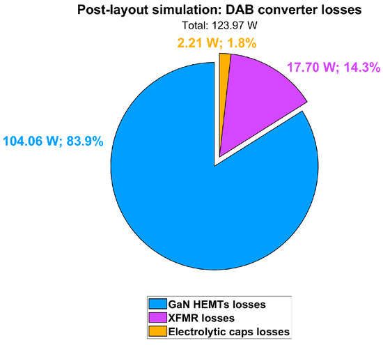 The total losses of the DAB converter can be then quantified as 123.97 W with a reduction of about 8 W with respect to the electrical simulation reported in Section 3 (Figure 21), and its efficiency turns out to be 98.16%. A pie chart of the DAB converter losses is shown in Figure 34.