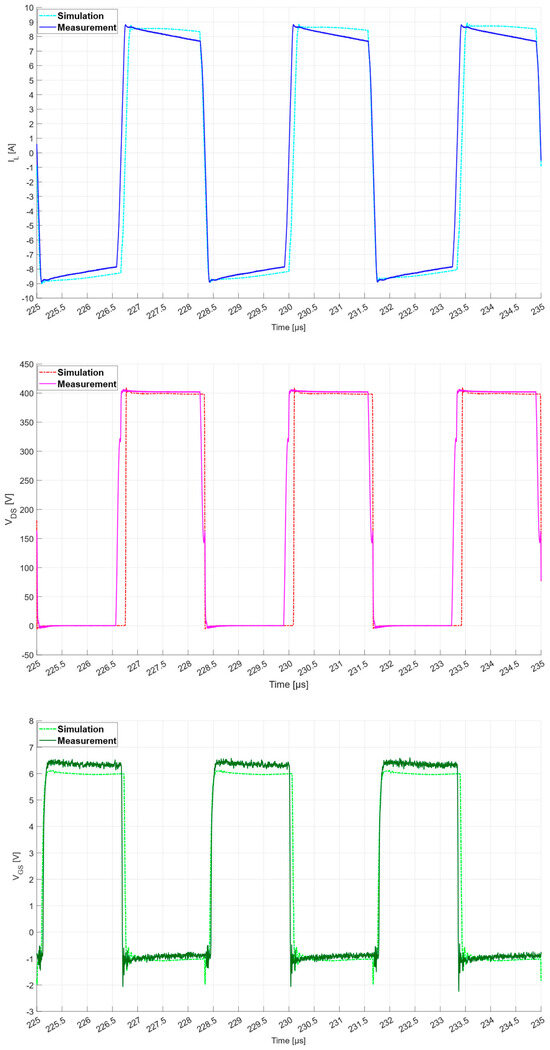 At present, the developed DAB converter prototype has been tested up to 3.3 kW. Since it is not possible to probe the current of the individual GaN device, the simulation results can only be verified on the basis of the global performances of the converter and by comparing the measurable waveforms. The temperature of the components acquired through the thermal camera and the global efficiency of the DAB converter are consistent with the simulation results. Moreover, as reported in Figure 36, the comparison between simulated and measured waveforms (series inductor current IL and VDS and VGS of Q2 at a 3.3 kW power level) exhibits optimal fitting and the absence of the typical ringing effect due to excessive parasitics. It is worth noticing that measurements have been performed exploiting wideband sensors (a 20 MHz Rogoski current probe and 100 MHz active differential voltage probe) and a digital oscilloscope (500 MHz MSO-56 Tektronix at 6.25 GS/s) that can capture without filtering/attenuating any eventual high-frequency component (e.g., ringing) of waveforms.