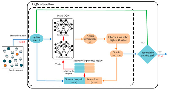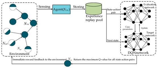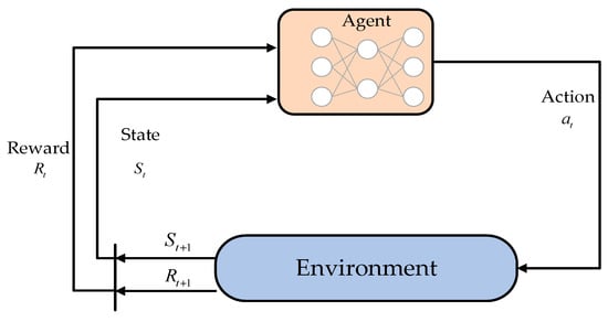Q-learning is a value iteration-based reinforcement learning algorithm that finds the optimal policy by continually updating the Q-values of state–action pairs. The original Q-learning algorithm is designed to handle finite and discrete action spaces. When faced with a vast number of state and action combinations, finding the action that maximizes the Q-value becomes exceptionally challenging, as this requires operations that involve evaluating or maximizing over an infinite number of possible actions, which is impractical in real-world scenarios. The process of deep reinforcement learning is illustrated in Figure 3.