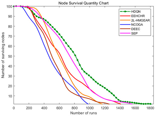 After setting up the clustering, six algorithms are run with the same initial parameters to compare the node survival rate in HWSNs. As shown in Figure 7, the HDQN algorithm is compared with EEHCHR, 2L-HMGEAR, NCOGA, DEEC, and SEP. The aim is to observe how the node survival rate varies with the number of operational rounds, with the maximum number of rounds set to 1800 and a total of 100 nodes in the network. The NCOGA algorithm is the first to deplete the energy of an initial heterogeneous node at round 111. In contrast, the HDQN algorithm depletes its first heterogeneous node’s energy at round 179, and the SEP algorithm experiences the depletion of its first node’s energy at round 198. This indicates that SEP performs the best in terms of node survival rate during the early stages of operation, due to its specialized optimization design that accounts for the differences in initial energy levels among ordinary, advanced, and super nodes in HWSNs. This design effectively prolongs node survival, especially in the initial phases.
