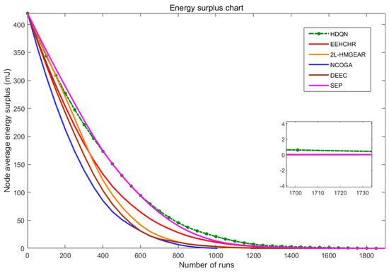 As presented in Figure 8, after running for the same number of rounds, a comparison of the average remaining energy of the nodes among the six algorithms, including HDQN and five other algorithms, is conducted. This comparison focuses on how the average remaining energy of the heterogeneous nodes changes with the number of rounds. The maximum number of rounds is set at 1600. At round 1006, the average remaining energy of nodes running the NCOGA algorithm drops to 0 mJ. For the algorithms 2L-HMGEAR, DEEC, EEHCHR, SEP, and HDQN, the rounds at which the average remaining energy of nodes first drops to 0 mJ are 1305, 1431, 1458, 1713, and 1844, respectively. The experimental results indicate that the HDQN algorithm, by employing deep reinforcement learning to select information transmission paths, significantly enhances the efficiency of energy utilization in heterogeneous nodes. This leads to a more balanced energy consumption across nodes. Consequently, the HDQN algorithm maintains a higher average remaining energy of nodes over the same number of rounds compared to the other algorithms.