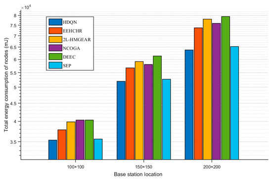The comparative experiment of BS position changes in HWSNs is designed to verify the robustness of the energy efficiency optimization algorithms. In HWSNs, the positions of BSs may vary depending on different tasks. Under the same number of iterations, if the BS position changes, the proposed algorithm should still be able to operate efficiently and consume less energy, demonstrating its robustness in energy efficiency optimization across various application scenarios of HWSNs. As shown in Figure 10, the HDQN algorithm is compared with five other algorithms to analyze the impact of BS position changes on energy efficiency optimization algorithms in HWSNs. The BS positions are set to (100, 100), (150, 150), and (200, 200). In these three BS positions, all six algorithms run for 700 rounds. The DEEC algorithm exhibits the highest total energy consumption, while the total energy consumption of the 2L-HMGEAR and NCOGA algorithms are similar, increasing as the BS position changes from (150, 150) to (200, 200). The SEP algorithm and the proposed HDQN algorithm show the best performance in terms of total network energy consumption, with the HDQN algorithm maintaining the lowest energy consumption across all three BS positions. The simulation results indicate that the HDQN algorithm demonstrates good robustness in energy efficiency optimization in various application scenarios with different BS positions.