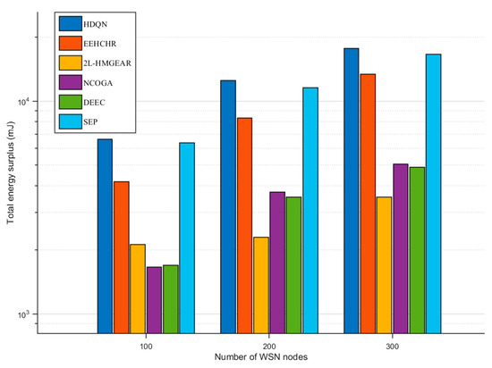 In various scenarios of HWSNs operations, the number of nodes typically changes according to different application requirements. If the proposed algorithm exhibits good energy efficiency optimization performance across different node counts in HWSNs, it indicates the strong adaptability of the algorithm. As illustrated in Figure 11, to validate the performance of the HDQN algorithm in energy efficiency optimization with varying node numbers, it is compared with five other algorithms. The total network energy consumption of various algorithms is analyzed as the number of nodes changes. The number of nodes in the HWSNs is set to 100, 200, and 300, with all six algorithms running for 700 rounds under identical initial parameters. The proposed HDQN algorithm consistently ranks among the top in terms of total remaining energy across all three node counts. This observation indicates that the HDQN algorithm effectively reduces network energy consumption in scenarios with varying numbers of HWSNs nodes, demonstrating its robust adaptability and energy efficiency optimization capabilities.