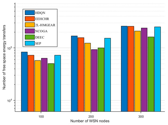 According to the classic energy equation for wireless sensor networks, under the same node and operation round conditions, a higher number of transmissions using the free-space energy model indicates a more effective energy efficiency optimization strategy for HWSNs. As depicted in Figure 12, the HDQN algorithm is compared with five other algorithms (DEEC, 2L-HMGEAR, NCOGA, SEP, and EEHCHR) in terms of the number of transmissions using the free-space energy model across heterogeneous node counts of 100, 200, and 300. This comparison examines how the number of transmissions using the free-space energy model varies with an increasing number of nodes for these six algorithms. In the scenario with 300 nodes and identical initial conditions, the DEEC algorithm exhibits the lowest number of transmissions using the free-space energy model. The 2L-HMGEAR, NCOGA, and SEP algorithms show similar transmission counts, which are slightly lower than those of the EEHCHR and HDQN algorithms. Notably, the number of transmissions using the free-space energy model for all six algorithms increases steadily with the number of nodes, which is consistent with the expectation of increased communication activity as the network size grows. Importantly, the proposed HDQN algorithm consistently ranks first in the number of transmissions using the free-space energy model across different node counts (100, 200, and 300 nodes). This indicates that the HDQN facilitates more transmissions under the same energy conditions, thereby demonstrating superior energy efficiency optimization. This performance underscores that the HDQN algorithm enhances energy efficiency optimization in various application scenarios of HWSNs and exhibits robust performance across different network sizes.