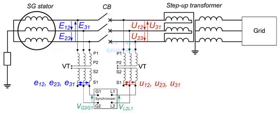 According to standards for salient-pole [21] and cylindrical rotor SGs [22], the machines must be designed to withstand a voltage magnitude mismatch of ΔU0 = +5% during synchronization. This specification considers the SG’s rated voltage as the reference, implying that the SG’s induced voltage should be higher than the voltage of the running system immediately before synchronization. Therefore, proper excitation control should be performed by the synchronizer in order to ensure that the SG’s electro-magnetomotive force magnitude is just above the system voltage magnitude before synchronization.