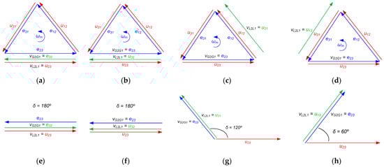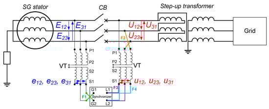 Following the examples of erroneous wirings shown in Figure 3, the phasor constructions featuring the VTs’ secondary-side line-voltage values (e12, e23, and e31 for the machine-side VT; u12, u23, and u31 for the system-side VT) are shown in Figure 4. The synchronizer (ANSI 25) ensures zero-phase shift between voltages vG2G1 and vL2L1. These voltages depend on the wirings of the VTs and the synchronizer. Any error in these wirings may imply that vG2G1 and vL2L1 being in phase mean an actual phase shift between the voltages across the CB, thus a non-zero rotor angle.