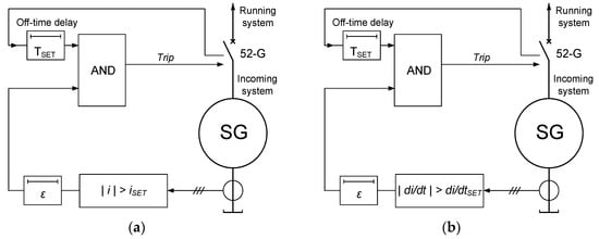 The setting of the instantaneous overcurrent threshold (iSET) should be adjusted above the peak current value for a normal synchronization. This threshold can be calculated by particularizing iAC + iDC, derived from Equations (4) and (5), for t = t0 ≈ 0+ and δ = δ0 and replacing δ0 with the maximum admissible phase angle mismatch. The setting of the instantaneous current-derivative threshold (di/dtSET) should be set above the peak current-derivative value for a normal synchronization. This threshold can be calculated by particularizing Equation (11) for t = t0 ≈ 0+, resorting to Equations (1) and (2) for the dynamics of δ. The protective schemes are enabled shortly before the synchronization instant (t = t0) and are disabled after an adjustable time delay (TSET) prior to increasing the power output.