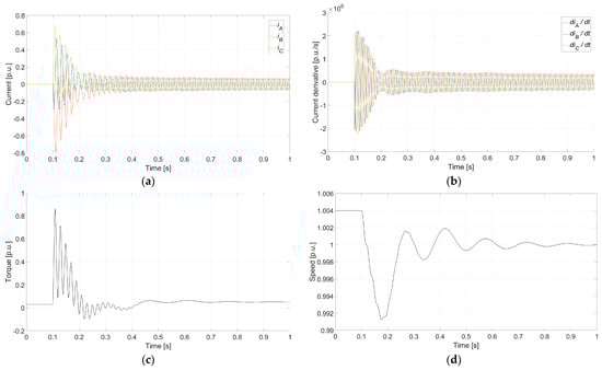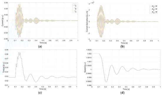 Figure 16 presents the behavior of the instantaneous synchronization currents for each phase (Figure 16a) as well as the evolution of their instantaneous time derivatives (Figure 16b). In this scenario, the currents surge to nearly their rated value after CB closing. Following the transient phase, the currents stabilize at approximately 0.1 p.u. in the steady state, which corresponds to the active power supplied by the induction motor, operating at 50.10 Hz and 1500 rpm. The instantaneous current derivatives also show a significant response, with a peak value in the first half-cycle of 295 p.u./s.