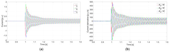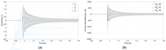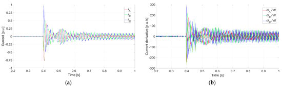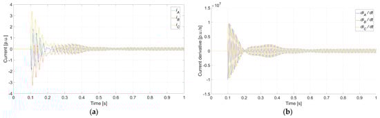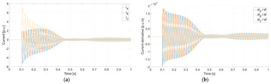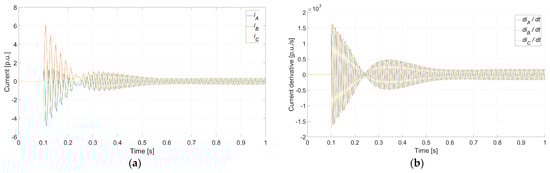 Faulty synchronization (Case 5: ΔU0 = 0%, Δδ0 = 180°, and Δf0 = 0.1 Hz) conducted at t = 0.1 s: (a) instantaneous current for each phase; (b) instantaneous current derivative for each phase.
