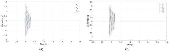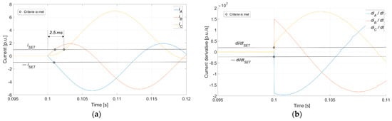 The operation of the proposed protective schemes for Case 5 is illustrated in detail in Figure 13. The thresholds have been set according to the values of Case 2. The points where the tripping criteria are met are indicated in Figure 13. For the current-based scheme (Figure 13a), it is observed that the last phase (phase C) meets the tripping criteria approximately 2.5 ms after synchronization occurs at t = 0.1 s. In contrast, the current-derivative-based scheme activates immediately after synchronization at t = 0.1 s due to the sharp surge detected in the current-derivative calculation. Therefore, it is verified that the proposed method based on instantaneous current values performs significantly faster fault detection compared to state-of-the-art RMS-based overcurrent schemes, with detection times that do not exceed 2.5 ms.