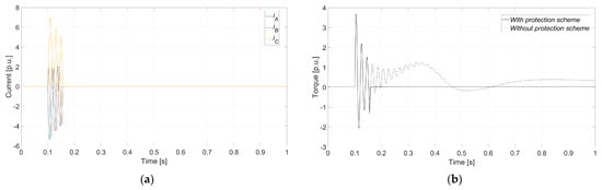 Once the tripping criteria are met, the protective schemes trigger the opening of the CB to clear the fault. Assuming a CB opening time of 50 ms, the circuit is opened no later than 53.5 ms after synchronization (2.5 ms for fault detection in phase C—the last phase in which the tripping criteria is met according to the instantaneous current value-based scheme, i.e., the longest fault detection time or worst-case scenario—1 ms for the intentional delay, and 50 ms for the CB to open). As shown in Figure 14a, the flow of high fault currents is thus limited to 53.5 ms after synchronization, effectively reducing the duration of electrical stress. Additionally, as seen in Figure 14b, the torque oscillations are significantly shortened, minimizing the risk of mechanical damage to the system. It is concluded that the proposed protection method reduces the fault detection time to only a few ms, which is an order of magnitude lower than conventional CB opening times. Having achieved fault detection time optimization, the performance of switchgear technology is left as the primary limiting factor for rapid fault clearance.