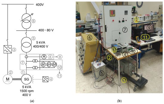The experimental tests were conducted on a 5 kVA four-pole SG (1), driven by an induction motor (2) powered by a variable frequency drive (VFD) (3). The excitation power was supplied by an independent DC power source (4). The SG was connected to the grid via a 5 kVA 1:1 power transformer (5) at an adjustable voltage up to 400 V. This voltage range for the connection bus was achieved through an adjustable three-phase power supply based on an autotransformer (6), allowing faulty synchronization tests to be performed at reduced system voltage, thereby preventing potential damage to the machine.