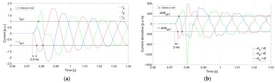 Additionally, a deliberate delay of ε = 1 ms can be introduced to prevent false tripping, ensuring more reliable protection. In all cases, once the tripping criteria are satisfied, it is verified that the conditions (instantaneous current or current-derivative values exceeding their respective thresholds) remain fulfilled throughout this time delay.
