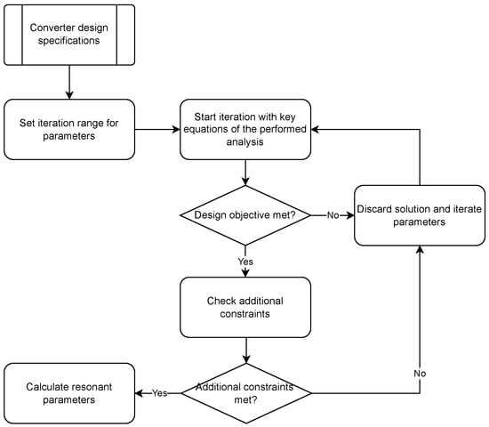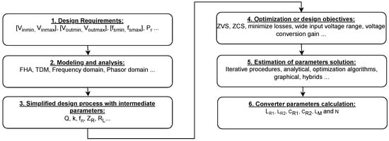A general workflow for the design methodology is summarized in Figure 2. First, an analysis of the converter topology is conducted based on the design requirements to understand how intermediate parameters influence the voltage gain curve, switching frequency range, soft switching capabilities, and power loss. Second, using FHA, Time Domain Modeling (TDM) or the frequency domain, among others, a methodology is developed based on iterative procedures, analytical calculations with constraints, optimization algorithms to find the optimal solution, etc.