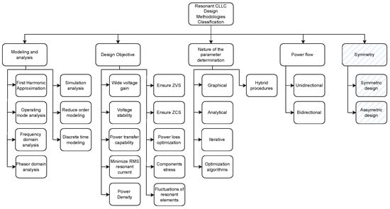 - Symmetric or asymmetric design: As shown in Figure 3, the classification of the design methodologies according to symmetry is highlighted in light blue, indicating that this applies for the CLLC resonant network. Since the CLLC resonant network has four resonant elements, the design methodology can be divided in two types: