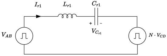Increasing efficiency by minimizing losses and ensuring soft switching capabilities are the general design objectives, as can be seen in many articles, such as in [35,36,37,38,46,47]. To obtain accurate solutions, frequency domain analysis with complete Fourier series is used in [37,46,47]. The equivalent circuit for the topology of Figure A3 is shown in Figure 4.