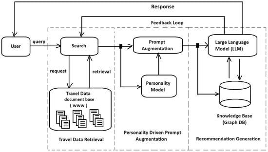 The search component sends a vectorized request to the document base related to travel data from the web. The request includes the specific parameters of the user’s query with personalized preferences and other relevant details. The travel data document base includes a web crawler module that processes the request and retrieves documents that match the query parameters. The document base consists of a vast collection of travel-related information sourced from the web (www). It aggregates data from various online sources to ensure comprehensive coverage of travel destinations, budget, travel guides/tips, activities, accommodation options, local attractions, user reviews, travel magazines/articles (travel trends) and other travel-related aspects. The document base is regularly updated to include the latest travel information so that users receive current and relevant recommendations. Documents in the base are categorized and indexed to facilitate efficient retrieval. The retrieved documents from the travel data document base are sent back to the search component. The search component then forwards improved queries including this retrieved information from documents for further processing with personality-driven prompt augmentation logic.