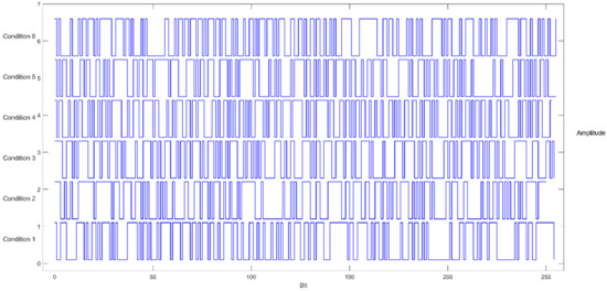 The graphic presentation for outputs of the presented hash function is illustrated in Figure 3 under six conditions with a 256-bit version as an instance of other 128-bit and 512-bit versions. The figures show the significant changes that the hash function makes on the output in different conditions.