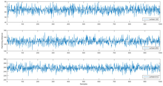 We aim at achieving an average of 50% probability of change in the hash value, and also, it is expected that change affects all bit positions. This change in bit positions also requires a uniform distribution. The bit variance test shows the uniformity of the bit change on the digest bit positions and is related to the avalanche effect of the proposed hash function. The changes in the bit positions are shown in Figure 7 for all versions of the proposed hash function. We generate 1000 random messages and corresponding hash values. Also, we use the chi-square test to check the uniform distribution of the variance on bit positions. The bit variance ranges from 454 to 556, which is expected to be 500 changes for 1000 tests. The critical chi-square value is calculated as 11.69, 6.69, and 11.71, respectively, for 128-bit, 256-bit, and 512-bit versions. All versions of the proposed hash function passed the test, and the variance on bit positions has a uniform distribution as a result.