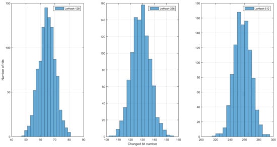 Firstly, we use a pseudorandom number generator called Mersenne Twister (MT19937) to create 1000 random text messages, and corresponding hash values are generated. Afterward, we change a bit on an arbitrary position in the original message and generate its corresponding hash value. The change data between these two hash values are given in Table 3, and other hash function data are added for comparison. The average number of bit changes and the percentage of bit changes reach the ideal value of 50% across all versions of the proposed hash function. The standard deviation value is desired to be small in order to keep the bit change in the required range. As can be seen from the table, the proposed hash function has a lower standard deviation of Bc and Rc values than the others.