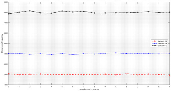 The hash value must have a uniform distribution to resist pre-image or second pre-image attacks. A brute-force attack can be the easiest way to find the first or second pre-image of the hash value if there is a weakness. There are some other faster pre-image attacks as a result of cryptanalysis for particular hash functions. We generated 1000 random messages to observe the frequency distribution of hash values, as demonstrated in Figure 6. The number of each hexadecimal character in the hash value is calculated to show the distribution of the hash value. It is expected that each hexadecimal character will occur in equal numbers. A chi-square test (Equation (8)) was employed as a goodness-of-fit test to determine whether the hash value is distributed uniformly across all versions of the proposed hash function. For 1000 random messages, the number of expected hexadecimal characters () is 8000 for the 512-bit version, which ranges from 7854 to 8144 (). The critical chi-square value () is calculated as 11.71, which means the null hypothesis (, the hash value is uniformly distributed) is true for any alpha value. The range of hexadecimal characters is from 3919 to 4080 for the 256-bit version, and the critical chi-square value is 6.69, which has a minimal error rate. Also, the hexadecimal characters range from 1924 to 2073 for the 128-bit version, and the critical chi-square value is 11.69, which makes the null hypothesis true over again.