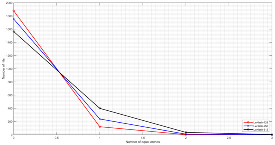 The collision test finds the same hash outputs, which have different input messages. Collision resistance is one of the main properties of cryptographic hash functions. It is assumed that collisions are inevitable in an enormous sample space. It is unfeasible to test all possible hash values due to the considerable sample space (, etc.) for desired digest size. The method of Wong [72] is applicable instead of testing all possibilities to measure the collision resistance of hash functions. We generate 2000 random messages and corresponding hash values, which are stored in ASCII format. Then, we change a single bit in a random position and generate a new hash value for changed messages. We count the number of the same ASCII characters in the exact location (Ns) to measure the collision resistance. The number of equal entry values is desired to be as low as possible, and the proposed hash function results are shown in Figure 8. The maximum Ns value is 2 for 128-bit and 256-bit versions, and the maximum Ns value is 3 for the 512-bit version. The maximum Ns values are reasonable when compared to other hash functions. The other exhibited performance is that there are no equal entries in 93% of the testing for the 128-bit version and close results for other versions.